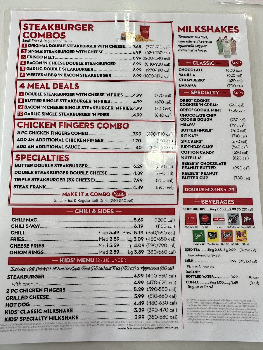 At this location, you'll find a menu focused on essential favorites, ensuring every item is crafted to perfection. The Original Double Steakburger with Cheese Combo is a standout, featuring two juicy steakburgers adorned with American cheese, fresh toppings, crispy fries, and a drink—all for just $7.09. If you're feeling extra indulgent, the Double Steakburger Double Cheese Combo treats you to even more cheesy goodness for $7.74. And let’s not overlook the Frisco Melt Combo, where delightfully melted cheeses embrace grilled steakburgers on a toasted bun.